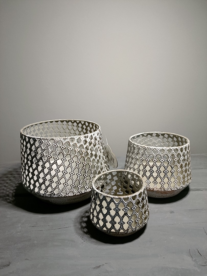 Een sfeervolle set van drie rustieke windlichten in wit-grijs metaal — perfect om warmte en karakter toe te voegen binnen en buiten onder overkapping of veranda.